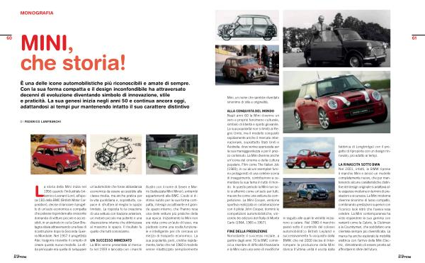 ALLA CONQUISTA DEL MONDO Negli anni 60 la Mini divenne un vero e proprio fenomeno culturale, simbolo di libertà e spirito giovanile. La sua popolarità non si limitò al Regno Unito, ma il modello conquistò rapidamente anche il mercato internazionale, soprattutto Stati Uniti e Australia, dove veniva apprezzata per la sua maneggevolezza e per il prezzo contenuto. La Mini divenne anche un’ icona del cinema e della cultura popolare. Film come The Italian Job( 1969), in cui alcuni esemplari furono protagonisti di una celebre scena di inseguimento, contribuirono a cementare la sua fama in tutto il mondo. In questo periodo la Mini non solo si affermò come un’ auto per tutti, ma anche come una vettura da competizione. La Mini Cooper, versione sportiva realizzata in collaborazione con il pilota John Cooper, dominò le competizioni automobilistiche, vincendo tre edizioni del Rally di Monte Carlo( 1964, 1965 e 1967).