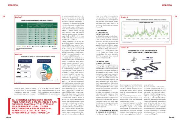 L ’ INTERESSE VERSO IL MONDO ELETTRICO Per un mercato in crescita e dinamico come quello delle autovetture elettriche , gli indicatori ufficiali relativi alle immatricolazioni possono nascondere una parte delle prospettive future , correlate al grado di interesse dei nuovi potenziali consumatori verso il prodotto . Il grafico di Google Trends ( Grafico 9 ) evidenzia l ’ interesse crescente dei consumatori relativo ad auto elettriche e ibride in Italia . Significativo anche lo spaccato per fasce chilometriche degli spostamenti in auto , che conferma come i principali modelli elettrici coprano le esigenze di spostamento giornaliero del 97 % degli utenti ( Grafico 10 ). In sintesi , sta cambiando in modo permanente la mobility experience , che si affida sempre di più a piattaforme IT integrate dove pianificare e programmare tragitti e ricariche elettriche , effettuare prenotazioni e pagamenti di parcheggi , car-bike-scooter sharing elettrico , collegarsi con i servizi di mobilità inclusi nel welfare aziendale …