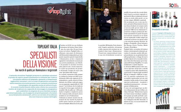Fondata nel 2016 con una brillante intuizione dal titolare Dario Salvagno , che vanta oltre 30 anni d ' esperienza nel settore , Toplight Italia si è affermata come punto di riferimento nell ’ aftermarket indipendente per tutto quanto riguarda spazzole tergicristallo e illuminazione , inclusi i componenti aggiuntivi eventualmente necessari per una corretta installazione , con l ’ obiettivo di garantire la massima sicurezza nella guida di auto , veicoli commerciali e truck : una peculiarità che permette all ’ azienda vicentina di essere nota come “ specialista della visione ”. La costante espansione della gamma in catalogo ha portato nel 2023 al trasferimento dalla sede originaria di Castelgomberto a quella attuale di Schio , distante circa 20 km e molto più ampia , con un magazzino soppalcabile di 1.500 mq per 7 m di altezza che ha triplicato la capacità di stoccaggio rendendo disponibili 3 file di pallet per 1.000 posti . Anche la logistica è migliorata grazie alla vicinanza delle principali arterie stradali , tra cui la Pedemontana . I fatturati in costante crescita sono alimentati dai due marchi di proprietà : quello storico lanciato per primo sul mercato Toplight affiancato poi da quel-