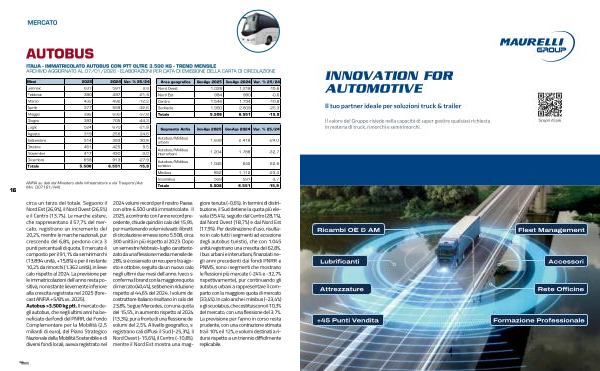 Minibus 852 1.112-23,4 Scuolabus 569 591-3,7 Totale 5.508 6.551-15,9 circa un terzo del totale. Seguono il Nord Est( 26,9 %), il Nord Ovest( 26,5 %) e il Centro( 13,7 %). Le marche estere, che rappresentano il 57,7 % del mercato, registrano un incremento del 20,2 %, mentre le marche nazionali, pur crescendo del 6,8 %, perdono circa 3 punti percentuali di quota. Il mercato è composto per il 91,1 % da semirimorchi( 13.894 unità, + 15,8 %) e per il restante 10,2 % da rimorchi( 1.362 unità), in lieve calo rispetto al 2024. La previsione per le immatricolazioni dell’ anno resta positiva, nonostante lievemente inferiore alla crescita registrata nel 2025( forecast ANFIA + 5 / 8 % vs. 2025). Autobus > 3.500 kg ptt. Il mercato degli autobus, che negli ultimi anni ha beneficiato dei fondi del PNRR, del Fondo Complementare per la Mobilità( 2,5 miliardi di euro), del Piano Strategico Nazionale della Mobilità Sostenibile e di diversi fondi locali, aveva registrato nel