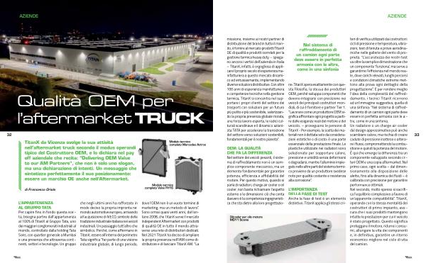 teri di verifica utilizzati dai costruttori: cicli di pressione e temperatura, vibrazioni, test di tenuta e prove aerodinamiche nelle gallerie del vento di proprietà.“ L’ accuratezza dei nostri test va oltre la semplice dimostrazione che un componente‘ funziona’, ma serve a garantirne l’ efficienza nel mondo reale, dove carichi elevati, lunghi percorsi e condizioni climatiche estreme mettono alla prova ogni dettaglio della progettazione”. E per rendere meglio l’ idea della complessità del raffreddamento, i tecnici TitanX ricorrono ad un’ immagine suggestiva, quella di una sinfonia:“ Nel sistema di raffreddamento di un camion ogni parte deve essere in perfetta armonia con le altre, come in una sinfonia. Un radiatore o un charge air cooler dal design approssimativo può anche scambiare calore, ma rischia di creare cadute di pressione inattese o alterare i flussi, compromettendo la combustione e quindi la potenza del motore. È qui che emerge la differenza tra un componente sviluppato secondo criteri OEM e una copia aftermarket. Nel primo caso, ogni scelta – dal dimensionamento alla disposizione delle alette, fino alla dinamica dei fluidi – è calibrata con precisione per garantire performance ottimali. Nel secondo, molto spesso si sacrifica l’ equilibrio complessivo a favore di un’ apparente compatibilità”. TitanX, operando con la stessa mentalità dei costruttori di primo impianto, assicura che i suoi prodotti mantengono intatte le prestazioni per cui il veicolo è stato progettato. Questo significa proteggere il motore, ridurre i consumi, allungare la vita dei componenti e, in definitiva, garantire un ritorno economico migliore nel ciclo di vita del camion. |