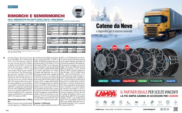 so positivamente il 2022 , proseguendo la crescita del 2021 (+ 32,4 % vs 2020 ). Nel 2022 il comparto ha visto immatricolate 16.793 unità , l ’ 11 % in più rispetto al 2021 . La crescita maggiore riguarda il mercato del Nord Ovest (+ 13,9 %), seguito dal Nord Est con + 10,9 %, dal Centro con + 10,5 % ed infine dal Sud-Isole con + 8,7 %. Il mercato più rilevante è quello del Nord Ovest , dove si è immatricolato il 31,7 % dei rimorchi , seguito dal Sud e Isole ( 29,2 % del mercato ), dal Centro ( 25 %) e infine dal Nord Est ( 14,1 % di market share ). Le marche estere ( con il 60,5 % del mercato ) registrano una crescita pari al 19,3 % nel cumulato da inizio anno , mentre le marche nazionali ( il rimanente 39,4 %) rimangono sostanzialmente stabili (+ 0,4 %). Il mercato si compone per il 91,8 % di semirimorchi ( 15.422 unità ) e per il solo 8,2 % di rimorchi ( 1.371 unità da inizio anno ).
