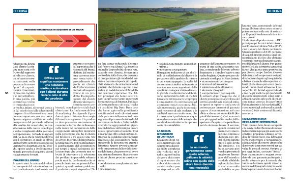 I VALORI DEL BRAND In questi anni , la catena del valore nel comparto del veicolo industriale si è radicalmente trasformata , soprattutto in merito all ’ esperienza che il cliente fa del brand , definita dal marketing customer journey , ossia tutto il procedimento che porta un cliente dall ’ informazione iniziale all ’ acquisto finale di un prodotto . Il comportamento del cliente dipende dai macrocambiamenti ambientali , tecnologici e sociali degli ultimi anni . La fondamentale leva di marketing che riguarda il prodotto è quindi diventata la strategia di brand management . Un prodotto deve possedere un insieme di contenuti e forme che richiamano nella mente del consumatore delle componenti intangibili rientranti nella percezione che ha il cliente del prodotto e tra queste una rete di servizi . In ordine di importanza , la tendenza che più ha influenzato il cambiamento del consumatore nel tempo è stata l ’ evoluzione della tecnologia che consente una velocità di intervento e di soluzione dei problemi impensabile soltanto pochi anni fa . La domanda che si pone il cliente ancora prima dell ’ acquisto è : quando avrò un problema , il produttore saprà rispondere ? Se