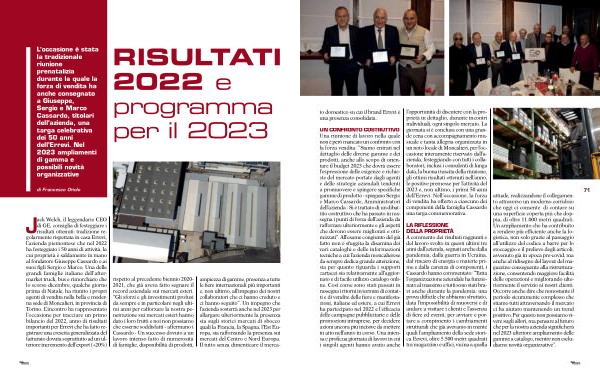 UN CONFRONTO COSTRUTTIVO Una riunione di lavoro nella quale non è però mancato un confronto con la forza vendita : “ Siamo entrati nel dettaglio delle diverse gamme e dei prodotti , anche allo scopo di orientare il budget 2023 che dovrà essere l ’ espressione delle esigenze e richieste del mercato portate dagli agenti e delle strategie aziendali tendenti a promuovere e spingere specifiche gamme di prodotto - spiegano Sergio e Marco Cassardo , Amministratori dell ’ azienda - Si è trattato di un dibattito costruttivo che ha passato in rassegna i punti di forza dell ’ azienda da rafforzare ulteriormente e gli aspetti che devono essere migliorati e ottimizzati ”. All ’ esame congiunto del già fatto non è sfuggita la disamina dei vari cataloghi e delle informazioni tecniche a cui l ’ azienda moncalierese da sempre dedica grande attenzione , sia per quanto riguarda i supporti cartacei sia relativamente all ’ aggiornato e di facile utilizzo catalogo online . Così come sono stati passati in rassegna i ritorni in termini di contatti e di vendite delle fiere e manifestazioni , italiane ed estere , a cui Errevi ha partecipato nel 2022 e l ’ efficacia delle campagne pubblicitarie e delle promozioni intraprese , per decidere azioni ancora più incisive da mettere in atto nell ’ anno in corso . Una intensa e proficua giornata di lavoro in cui i singoli agenti hanno avuto anche