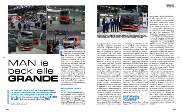 DEBUTTO ITALIANO PER IL MAN ETRUCK “ FULL ELECTRIC ” Dopo una lunga fase di test , l ’ eTruck targato MAN è pronto a conquistare la propria fetta di mercato . L ’ occasione del Transpotec è stata colta anche per celebrare l ’ ordine del primo eTGS 18.449 acquistato dall ’ azienda Sedamyl . Il nuovo “ full electric ” MAN sarà in grado di offrire dal 2025 autonomie giornaliere fino a 800 km , con pause di 45 minuti e batteria di 480 kWh . Il cuore pulsante del eTGS 18.449 trova spazio nel motore elettrico di 330 kW ( 449 CV ), configurato contenendo il più possibile la tara del veicolo . Cabina NN , la più compatta della gamma TGS . Quanto a batterie , MAN ha deciso di investire oltre 100 milioni direttamente nel suo stabilimento di Norimberga . Gli eTruck del Leone sono caratterizzati da un ’ elevata variabilità delle configurazioni delle batterie . Con sei pacchi batteria , di cui due installati sotto la cabina e fino ad altri quattro sui lati del telaio del veicolo , entrambi offrono fino a 480 kWh di capacità utilizzabile per un ’ autonomia giornaliera che oscilla tra i 600 e gli 800 km . MAN offre una serie di servizi specifici dedicati all ’ eTGS 18.449 , tra cui un programma di manutenzione personalizzato e un servizio di assistenza 24 ore su 24 . È stato sviluppato anche un software di gestione della flotta che permette di monitorare lo stato delle batterie e di ottimizzare i percorsi di ricarica . Un esemplare eTGS è stato ordinato durante la Fiera da Sedamyl , azienda cuneese leader nella produzione di resine e additivi , con la sua consociata inglese Sedamyl UK . Interesse , infine , per il TGS 41.540 8x4 e il TGM 18.320 4x2 a telaio , la cui facilità di allestimento ha caratterizzato l ’ evento organizzato da MAN con oltre 50 aziende e 70 ospiti partecipanti al primo incontro dedicato agli allestitori .