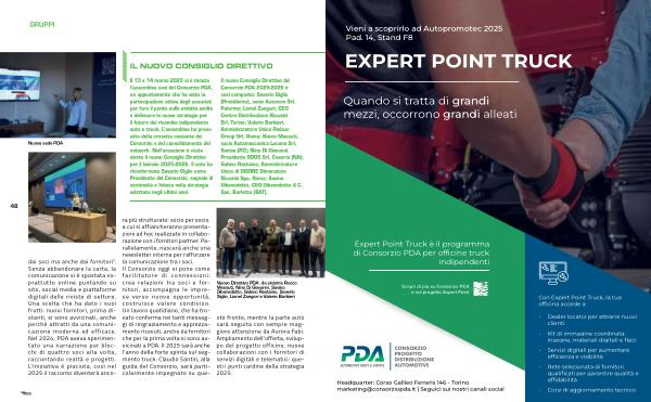 dai soci ma anche dai fornitori”. Senza abbandonare la carta, la comunicazione si è spostata soprattutto online puntando su sito, social media e piattaforme digitali delle riviste di settore. Una scelta che ha dato i suoi frutti: nuovi fornitori, prima distanti, si sono avvicinati, anche perché attratti da una comunicazione moderna ed efficace. Nel 2024, PDA aveva sperimentato una narrazione per blocchi di quattro soci alla volta, raccontando realtà e progetti. L’ iniziativa è piaciuta, così nel 2025 il racconto diventerà anco- ra più strutturato: socio per socio, a cui si affiancheranno presentazioni ad hoc realizzate in collaborazione con i fornitori partner. Parallelamente, nascerà anche una newsletter interna per rafforzare la comunicazione tra i soci. Il Consorzio oggi si pone come facilitatore di connessioni: crea relazioni tra soci e fornitori, accompagna le imprese verso nuove opportunità, costruisce valore condiviso. Un lavoro quotidiano, che ha trovato conferma nei tanti messaggi di ringraziamento e apprezzamento ricevuti, anche da fornitori che per la prima volta si sono avvicinati a PDA. Il 2025 sarà anche l’ anno della forte spinta sul segmento truck: Claudio Santin, alla guida del Consorzio, sarà particolarmente impegnato su que-