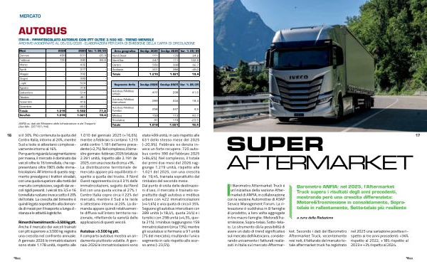 Il Barometro Aftermarket Truck è un’ iniziativa della sezione Aftermarket di ANFIA, in collaborazione con la sezione Automotive di ASAP Service Management Forum. La rilevazione è suddivisa in 8 famiglie di prodotto, a loro volta aggregate in tre macro famiglie: Motore & Trasmissione, Sopra-telaio, Sotto-telaio. Lo strumento dà la possibilità di avere un dato di trend significativo sul mercato dell’ Autocarro, considerando unicamente i fatturati realizzati in Italia sul mercato Aftermarket. Secondo i dati del Barometro Aftermarket Truck, recentemente resi noti, il fatturato del mercato totale aftermarket truck ha registrato nel 2025 una variazione positiva rispetto ai tre anni precedenti: + 36 % rispetto al 2022, + 18 % rispetto al 2023 e + 3 % rispetto al 2024.