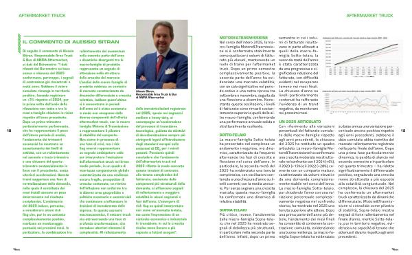 delle immatricolazioni registrato nel 2025, specie nei segmenti medium e heavy duty, si accompagna un’ accelerazione del processo di transizione tecnologica, guidata da obiettivi di decarbonizzazione sempre più stringenti legati all’ introduzione degli standard europei sulle emissioni di CO 2 per i veicoli pesanti. Possiamo quindi concludere che l’ andamento dell’ aftermarket truck nel 2025 riflette in modo coerente queste tensioni di contesto: alla tenuta complessiva del fatturato, sostenuta dalle componenti più strutturali della domanda, si affiancano segnali di rallentamento e maggiore volatilità in alcuni segmenti e fasi dell’ anno. L’ emergere di risk flag va quindi interpretato non come un’ anomalia isolata, ma come l’ espressione di un contesto economico e industriale in transizione, in cui la crescita risulta meno lineare e più esposta a fattori esogeni”.