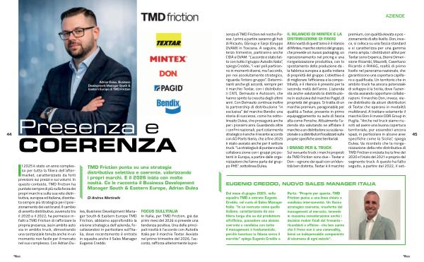 Il 2025 è stato un anno complesso per tutta la filiera dell’ aftermarket, caratterizzato da forti pressioni sui prezzi e sui volumi. In questo contesto, TMD Friction ha puntato sempre di più sulla forza dei propri marchi e sulla sua rete distributiva, europea ed italiana, diventata sempre più strategica per il posizionamento dei vari brand. Il cambio di assetto distributivo, avvenuto tra il 2020 e il 2022, ha permesso infatti a TMD Friction di rafforzare la propria presenza, sia in ambito auto sia in ambito truck, dimostrando una sostanziale tenuta anche in un momento non facile per il mercato nel suo complesso. Con Adrian Dulea, Business Development Manager South & Eastern Europe TMD Friction, abbiamo approfondito la visione strategica dell’ azienda, focalizzandoci in particolare sull’ Italia, dove recentemente è entrato in squadra anche il Sales Manager Eugenio Creddo.
