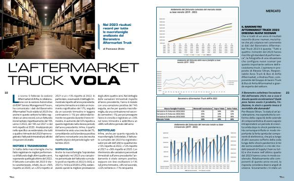 Lo scorso 5 febbraio la sezione Aftermarket di Anfia , in collaborazione con la sezione Automotive di ASAP Service Management Forum , ha comunicato i dati del Barometro Aftermarket Truck relativi al 2023 che anche in questo settore ha fatto registrare un anno record , con un fatturato incrementato rispettivamente del 16 % verso il 2022 , del 19 % sul 2021 e del 44 % rispetto al 2020 . Analizzando più nello specifico va evidenziato che tutti e quattro i trimestri del 2023 hanno registrato i fatturati trimestrali più alti dei cinque anni di analisi . MOTORE E TRASMISSIONE Si tratta della macrofamiglia che ha fatto registrare le migliori performance di fatturato degli ultimi quattro anni , superando quelle già ottime del 2022 . Il fatturato cumulato del 2023 è stato caratterizzato , infatti , da un + 56 % rispetto al 2020 , un + 25 % rispetto al
