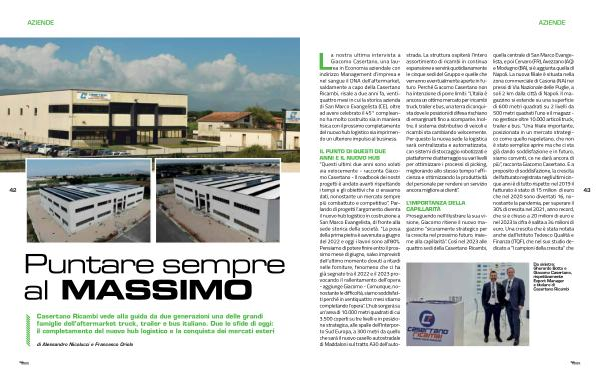 Casertano Ricambi vede alla guida da due generazioni una delle grandi famiglie dell ’ aftermarket truck , trailer e bus italiano . Due le sfide di oggi : il completamento del nuovo hub logistico e la conquista dei mercati esteri