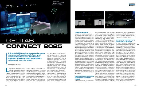 ECOSISTEMA DIGITALE PER IL FUTURO DELLA MOBILITÀ Le nuove soluzioni introdotte da Geotab non sono semplici strumenti tecnologici, ma fanno parte di un ecosistema di gestione delle flotte sempre più integrato. Il Centro per la Manutenzione, il Centro per la Sicurezza e il Centro per la Sostenibilità recentemente presentati lavorano in sinergia all’ interno della piattaforma MyGeotab, offrendo ai fleet manager una visione completa e centralizzata delle operazioni. I Geotab Innovation Awards 2025 hanno dimostrato come il futuro della mobilità sia già in atto e passi attraverso l’ uso intelligente dei dati. Manutenzione predittiva, sicurezza stradale e sostenibilità non sono più solo obiettivi da perseguire, ma realtà concrete per le aziende che scelgono di investire nell’ innovazione. Con strumenti sempre più avanzati e un ecosistema digitale in continua evoluzione la gestione delle flotte entra in una nuova era più sicura, efficiente e sostenibile.