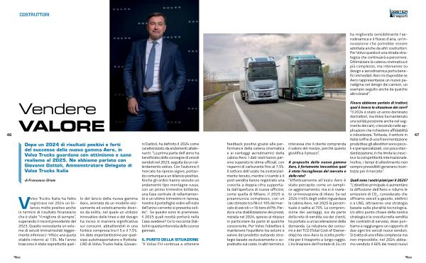 Volvo Trucks Italia ha fatto registrare nel 2024 un bilancio molto positivo anche in termini di risultato finanziario che è stato“ il migliore di sempre”, superando il record precedente del 2023. Questo nonostante un volume di veicoli immatricolati leggermente inferiore(-10%) e una quota stabile intorno al 13 %. Ma l’ anno trascorso è stato soprattutto quel- lo del lancio della nuova gamma Aero, animata da un modello visivamente ed esteticamente diverso da solito, nel quale un utilizzo innovativo delle linee e del design ha inciso in maniera significativa sui consumi, abbattendoli in una forbice compresa tra il 5 e il 7,5 %. Un dato importantissimo per qualsiasi autotrasportatore e flottista. L’ AD di Volvo Trucks Italia, Giovan- ni Dattoli, ha definito il 2024 come caratterizzato da andamenti altalenanti:“ La prima parte dell’ anno ha beneficiato delle consegne di veicoli venduti nel 2023, seguita da un rallentamento estivo. Con l’ autunno il mercato ha ripreso vigore, portando comunque a un bilancio positivo. Anche gli ordini hanno vissuto un andamento tipo montagne russe, con un primo trimestre brillante, una fase centrale di rallentamento e un ultimo trimestre in ripresa, mentre il portafoglio ordini all’ inizio dell’ anno corrente si presenta solido”. Se queste sono le premesse, il 2025 quali novità porterà nella Casa svedese? Ce lo racconta Dattoli in questa intervista dello scorso gennaio.