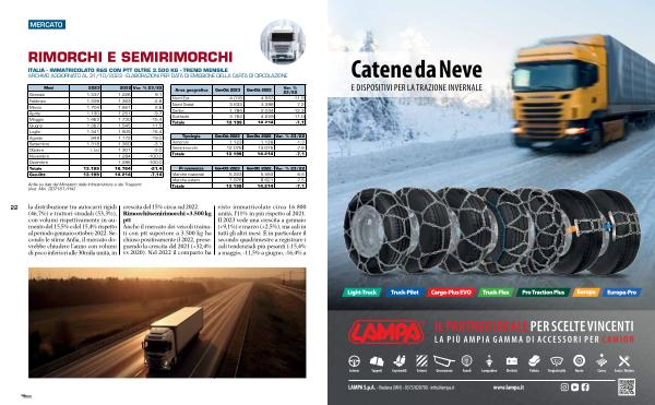 22 la distribuzione tra autocarri rigidi ( 46,7 %) e trattori stradali ( 53,3 %), con volumi rispettivamente in aumento del 15,5 % e del 15,4 % rispetto al periodo gennaio-ottobre 2022 . Secondo le stime Anfia , il mercato dovrebbe chiudere l ’ anno con volumi di poco inferiori alle 30mila unità , in crescita del 15 % circa sul 2022 . Rimorchi / semirimorchi > 3.500 kg ptt Anche il mercato dei veicoli trainati con ptt superiore a 3.500 kg ha chiuso positivamente il 2022 , proseguendo la crescita del 2021 (+ 32,4 % vs 2020 ). Nel 2022 il comparto ha visto immatricolate circa 16.800 unità , l ’ 11 % in più rispetto al 2021 . Il 2023 vede una crescita a gennaio (+ 9,1 %) e marzo (+ 2,5 %), ma cali in tutti gli altri mesi . È in particolare il secondo quadrimestre a registrare i cali tendenziali più pesanti ( -15,4 % a maggio , -11,5 % a giugno , -16,4 % a