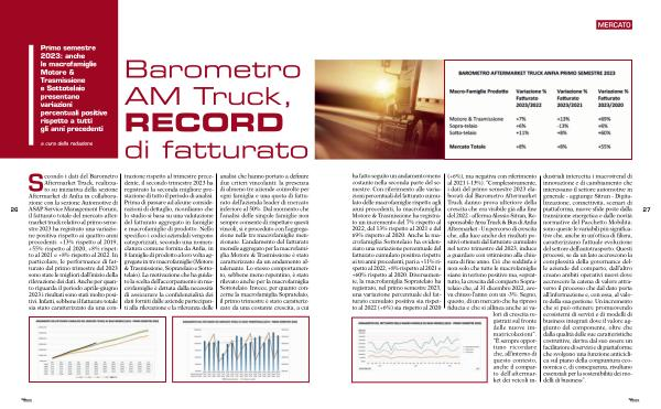 (+ 6 %), ma negativa con riferimento al 2021 ( -13 %). “ Complessivamente , i dati del primo semestre 2023 elaborati dal Barometro Aftermarket Truck danno prova ulteriore della crescita che era visibile già alla fine del 2022 - afferma Alessio Sitran , Responsabile Area Truck & Bus di Anfia Aftermarket - Un percorso di crescita che , alla luce anche dei risultati positivi ottenuti dal fatturato cumulato nel terzo trimestre del 2023 , induce a guardare con ottimismo alla chiusura di fine anno . Ciò che soddisfa è non solo che tutte le macrofamiglie siano in terreno positivo ma , soprattutto , la crescita del comparto Sopratelaio che , al 31 dicembre 2022 , aveva chiuso l ’ anno con un -3 %. Segno , questo , di un mercato che ha ripreso fiducia e che si allinea anche ai valori di crescita registrati sul fronte delle nuove immatricolazioni ”. “ È sempre opportuno ricordare che , all ’ interno di questo contesto , anche il comparto dell ’ aftermarket dei veicoli in- |