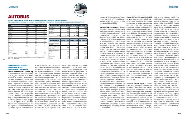DOMANDA DI VEICOLI COMMERCIALI E INDUSTRIALI IN ITALIA Veicoli commerciali < 3.500 kg.- Il mercato dei veicoli commerciali leggeri, che nel 2024 aveva sfiorato le 198.500 unità immatricolate, archivia i primi otto mesi del 2025 con una pesante contrazione. Da gennaio ad ottobre sono stati infatti immatricolati 158.693 veicoli, in calo del 5 % rispetto alle 167.131 unità registrate nello stesso periodo del 2024. Dopo i crolli a doppia cifra di gennaio(-16,2 %), febbraio(-15,5 %) e marzo(-14,1 %), la flessione si è attenuata ad aprile(-7,7 %) e maggio(-11 %). Giugno(-5,8 %) e i mesi estivi hanno mostrato segnali misti: luglio ha chiuso in lieve rialzo(+ 4,8 %) e agosto ha consolidato il trend positivo(+ 5,7 %). Anche nel bimestre settembre-ottobre la tendenza si mostra in crescita, rispettivamente con + 18,9 % e + 4,2 %. Sebbene presenti volumi in calo(-8,7 %), il diesel risulta ancora il carburante preferito. L’ 80,7 % dell’ immatricolato da inizio anno appartiene a questa motorizzazione, inclusa la“ variante” biodiesel. In calo nei dieci mesi anche tutte le altre alimentazioni ad eccezione dei veicoli BEV che crescono del 132,2 %, dei plug-in hybrid che hanno volumi di quasi 6 volte superiori a quelli del 2024 e dei benzina che crescono del 5,8 %. Il brand a registrare il maggior numero di immatricolazioni nel periodo rimane Fiat, con volumi che crescono del 6,3 % e una quota di mercato del 26,5 %. Seguono Ford, in calo del 3,2 % e con una market share del 17,5 % e Iveco, con il 7,2 % di quota e un calo del 17,5 %. Per distribuzione geografica, l’ a- rea con il maggior numero di immatricolazioni è il Nord Ovest, che costituisce il 36,8 % del mercato e che è anche l’ unica area con una crescita significativa(+ 17,5 % sui primi dieci mesi del 2024). In controtendenza, il Nord Est mostra una forte contrazione dei volumi(-32,4 % vs. 2024). In flessione, anche se più lieve il Sud con le Isole(-6,7 %). Volumi invece in aumento per il Centro(+ 6,5 %). Le regioni a registrare le vendite del comparto più alte restano il Piemonte( oltre 33mila unità immatricolate, + 47,2 %), la Lombardia( 22mila unità,-6,7 %) e il Lazio( oltre 20mila unità, + 43,1 %). Secondo le ultime