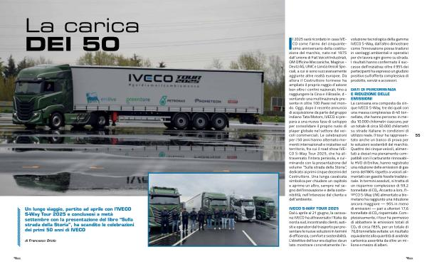Il 2025 sarà ricordato in casa IVE- CO come l’ anno del cinquantesimo anniversario della costituzione del marchio, nato nel 1975 dall’ unione di Fiat Veicoli Industriali, OM Officine Meccaniche, Magirus- Deutz AG, UNIC e Lancia Veicoli Speciali, a cui si sono successivamente aggiunte altre realtà europee. Da allora il Costruttore torinese ha ampliato il proprio raggio d’ azione ben oltre i confini nazionali, fino a raggiungere la Cina e il Brasile, diventando una multinazionale presente in oltre 100 Paesi nel mondo. Oggi, dopo il recente annuncio di acquisizione da parte del gruppo indiano Tata Motors, IVECO si prepara a una nuova fase di sviluppo per consolidare il proprio ruolo di player globale nel settore dei veicoli commerciali. Le celebrazioni per i 50 anni hanno alternato momenti internazionali e iniziative sul territorio, fra cui il road show IVE- CO S-Way Tour 2025, che ha attraversato l’ intera penisola, e culminando con la presentazione del volume“ Sulla strada della Storia”, dedicato ai primi cinque decenni del Costruttore. Una lunga cavalcata simbolica per chiudere un capitolo e aprirne un altro, sempre nel segno dell’ innovazione e della sostenibilità, nell’ interesse del cliente e dell’ ambiente.