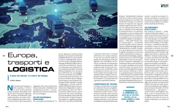 UN ITER DECISIONALE COMPLESSO Tra i principali provvedimenti“ in corsa” figurano la revisione della Direttiva sul trasporto combinato( COM( 2023) 702), che sta subendo un blocco ingiustificabile a parere di chi scrive, il Roadworthiness Package( COM( 2025) 180) sulla revisione dei controlli tecnici dei veicoli, l’ attuazione del sistema ETS 2 per il trasporto stradale, la riforma della Eurovignette con l’ inclusione del coefficiente CO 2 nei pedaggi e la futura proposta sul cosiddetto Greening Corporate Fleets, che punta a introdurre quote obbligatorie di veicoli a zero emissioni nelle grandi flotte aziendali. A questi si aggiungono i dossier sulla Direttiva AFIR( Alternative Fuels Infrastructure Regulation) e sull’ implementazione delle reti TEN-T, la revisione delle norme su pesi e dimensioni dei veicoli industriali, la nuova disciplina sull’ uso dei dati eFTI( electronic Freight Transport Information) e i regolamenti doganali e ICS2, che stanno ridefinendo