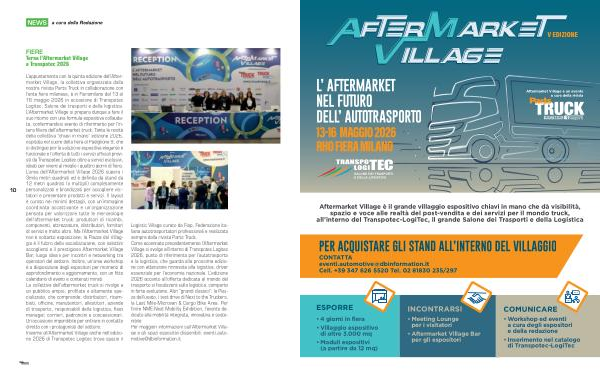 Logistic Village curato da Fiap, Federazione italiana autotrasportatori professionali e realizzato sempre dalla rivista Parts Truck. Come accennato precedentemente l’ Aftermarket Village si svolge all’ interno di Transpotec Logitec 2026, punto di riferimento per l’ autotrasporto e la logistica, che guarda alla prossima edizione con attenzione rinnovata alla logistica, driver essenziale per l’ economia nazionale. L’ edizione 2026 accanto all’ offerta dedicata al mondo del trasporto si focalizzerà sulla logistica, comparto in forte evoluzione. Altri“ grandi classici”: la Piazza dell’ usato, i test drive di Next to the Truckers, la Last Mile-Microvan & Cargo Bike Area. Per finire NME-Next Mobility Exhibition, l’ evento dedicato alla mobilità integrata, innovativa e sostenibile. Per maggiori informazioni sull’ Aftermarket Village e gli spazi espositivi disponibili: eventi. automotive @ dbinformation. it