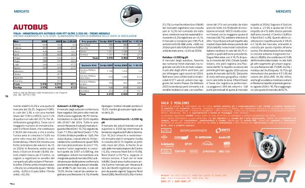 Autobus > 3.500 kg ptt Il mercato degli autobus, favorito dai numerosi fondi stanziati, ha registrato nel 2023 le immatricolazioni più alte degli ultimi vent’ anni, per poi infrangere ogni record nel 2024. Nell’ anno sono infatti stati immatricolati 6.571 veicoli, volumi mai raggiunti nel nostro Paese. Da febbraio 2025 la tendenza però si inverte e le vendite risultano in calo, con una flessione del 21 % nel cumulato da inizio anno( in tutto 3.476 libretti di circolazione emessi). IVECO risulta essere il brand con la maggiore quota di mercato( 36,7 %), sebbene inferiore di oltre 12 punti percentuali rispetto alla market share dello stesso periodo del 2024( 48,9 %). I volumi del costruttore italiano risultano in calo del 40,7 % rispetto a quelli dell’ anno precedente. Segue Mercedes con il 16,7 % di quota, in crescita del 3,9 %. Chiude il podio Solaris, che però registra una flessione dell’ 8,1 % rispetto ai volumi del periodo gennaio-agosto 2024 ed una quota di mercato del 6,9 %. Dal punto di vista dell’ area geografica, risultano in calo tutte le zone: il Nord Ovest è l’ area che registra la performance peggiore(-36 % dei volumi e-3,8 punti percentuali di quota di mercato rispetto al 2024). Seguono il Sud con le Isole a-27,9 % e quota del 37,4 %( rispetto al 41 % dello stesso periodo dell’ anno scorso), il Centro(-6,8 %) e il Nord Est(-4,9 %). Questi ultimi costituiscono rispettivamente il 29,4 % e il 16,9 % del mercato, entrambi in crescita per quota rispetto all’ anno scorso. Per destinazione d’ uso risulta in crescita soltanto il segmento turistico(+ 38,8 %), che costituisce il 21,8 % dell’ immatricolato totale. In calo tutti gli altri segmenti: gli urbani segnano una flessione del 7 %( MS 33,5 %), i minibus del 34,6 %( quota 15,7 %) e gli interurbani che perdono il 51,9 % dei volumi del 2024( MS 19,3 %). Infine, anche gli scuolabus mostrano volumi in flessione rispetto al periodo gennaio-agosto 2024(-10,1 %) e raggiungono una quota di mercato del 9,7 %.