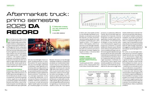 I dati del Barometro Aftermarket Truck pubblicati dall’ Anfia lo scorso luglio, iniziativa della sezione Aftermarket di Anfia in collaborazione con la sezione Automotive di ASAP Service Management Forum, evidenziano come il fatturato del primo semestre 2025 del mercato totale aftermarket truck ha registrato una variazione positiva rispetto ai tre anni precedenti: + 35 % rispetto al 2022, + 25 % rispetto al 2023 e + 13 % rispetto al 2024. In particolare, le prestazioni di fatturato del primo trimestre del 2025 sono state le migliori dall’ inizio della rilevazione dei dati, mentre quelle del secondo trimestre sono state le quarte migliori registrate fino ad oggi.