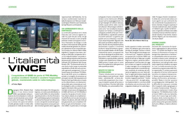 VISIONE CHIARA DEL MERCATO Secondo Zilli, il processo di acquisizioni e aggregazioni in atto presenta rischi:“ La qualità del Made in Italy rimane un riferimento in Europa ma bisogna fare attenzione a mantenere competitività contro la concorrenza estera a basso costo, evitando ad esempio eccessi di servizio nella distribuzione: non tutti gli ordini sono tanto urgenti da richiedere consegne in 2 ore. La ricetta vincente è la manutenzione programmata delle flotte organizzate. E contano parimenti la capacità di fornire informazioni tecniche e le relazioni interpersonali. Stiamo quindi puntando sul marketing e da fine anno, ad esempio, i prodotti‘ Made in Vicchio’ avranno un packaging ben distinguibile”. Se le difficoltà non mancano, conclude Zilli, il supporto della capogruppo si è rivelato fondamentale:“ Riusciremo così a mantenere il nostro Dna bolognese. TVS Mobility tiene molto al brand SABO e alla sua italianità, tanto che il nuovo logo avrà sottolineature della nostra bandiera. E i costanti investimenti nel Belpaese, a partire dal quartier generale stabilito da 6 anni a Milano, ci danno ulteriore fiducia”.