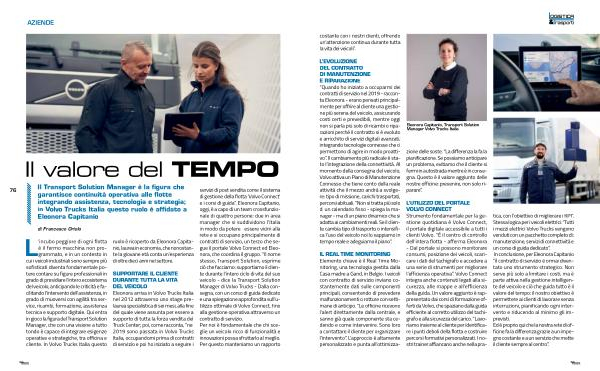 SUPPORTARE IL CLIENTE DURANTE TUTTA LA VITA DEL VEICOLO Eleonora arriva in Volvo Trucks Italia nel 2012 attraverso uno stage prelaurea specialistica di sei mesi, alla fine del quale viene assunta per essere a supporto di tutta la forza vendita del Truck Center; poi, come racconta,“ nel 2019 sono passata in Volvo Trucks Italia, occupandomi prima di contratti di servizio e poi ho iniziato a seguire i servizi di post vendita come il sistema di gestione della flotta‘ Volvo Connect’ e i corsi di guida”. Eleonora Capitanio, oggi, è a capo di un team crossfunzionale di quattro persone: due in area manager che si suddividono l’ Italia in modo da potere essere vicini alla rete e si occupano principalmente di contratti di servizio, un terzo che segue il portale Volvo Connect ed Eleonora, che coordina il gruppo.“ Il nome stesso, Transport Solution, esprime ciò che facciamo: supportiamo il cliente durante l’ intero ciclo di vita del suo veicolo- dice la Transport Solution Manager di Volvo Trucks- Dalla consegna, con un corso di guida dedicato e una spiegazione approfondita sull’ u- tilizzo ottimale di Volvo Connect, fino alla gestione operativa attraverso un contratto di servizio. Per noi è fondamentale che chi sceglie un veicolo ricco di funzionalità e innovazioni possa sfruttarlo al meglio. Per questo manteniamo un rapporto