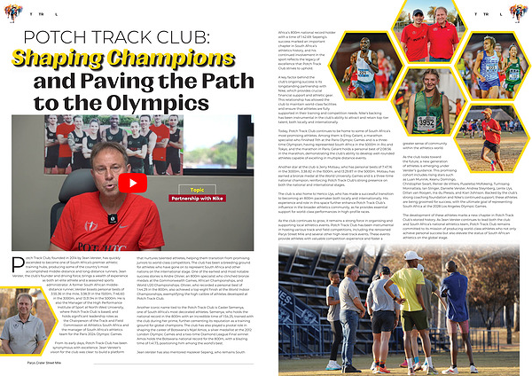 Potch Track Club , founded in 2014 by Jean Verster , has quickly ascended to become one of South Africa ’ s premier athletic training hubs , producing some of the country ’ s most accomplished middle-distance and long-distance runners . Jean Verster , the club ’ s founder and driving force , brings a wealth of experience as both an elite athlete and a seasoned sports administrator . A former South African middledistance runner , Verster boasts personal bests of 3:55.36 in the mile , 3:38.31 in the 1500m , 7:46.60 in the 3000m , and 13:31.94 in the 5000m . He is also the Manager of the High Performance Institute of Sport at North-West University , where Potch Track Club is based , and holds significant leadership roles as the Chairperson of the Track and Field Commission at Athletics South Africa and the manager of South Africa ’ s athletics team for the Paris 2024 Olympic Games .