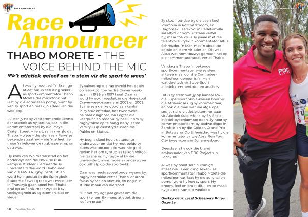 Al was hy nooit self ‘ n kranige atleet nie , is een ding seker - as sportkommentator Thabo Molete die mikrofoon vat , laat hy die adrenalien pomp , want hy ken sy sport en maak jou deel van die wedloop .