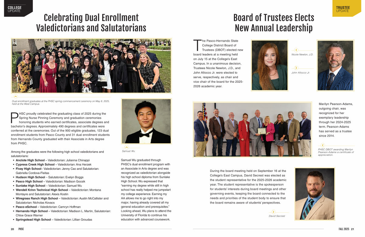 Samuel Wu graduated through PHSC’ s dual enrollment program with an Associate in Arts degree and was recognized as valedictorian alongside his high school diploma from Sunlake High School. Wu expressed that“ earning my degree while still in high school has really helped me jumpstart my college experience. Earning my AA allows me to go right into my major, having already covered all my general education and prerequisites.” Looking ahead, Wu plans to attend the University of Florida to continue his education with advanced coursework.