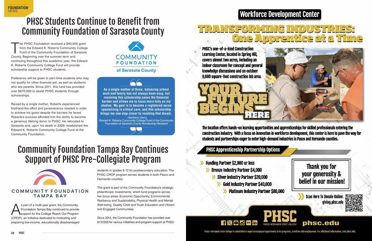 The PHSC Foundation received a $ 40,000 grant from the Edward K. Roberts Community College Fund of the Community Foundation of Sarasota County. Beginning over the summer term and continuing throughout this academic year, the Edward K. Roberts Community College Fund will provide scholarship support to PHSC students.