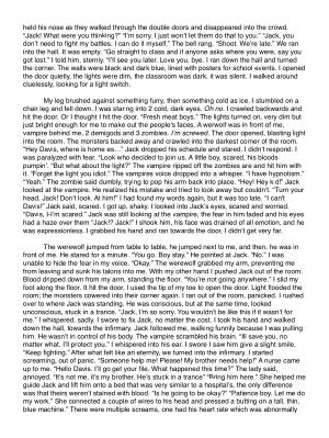 My leg brushed against something furry , then something cold as ice . I stumbled on a chair leg and fell down . I was staring into 2 cold , dark eyes . Oh no . I crawled backwards and hit the door . Or I thought I hit the door . “ Fresh meat boys .” The lights turned on , very dim but just bright enough for me to make out the people ' s faces . A werwolf was in front of me , vampire behind me , 2 demigods and 3 zombies . I ’ m screwed . The door opened , blasting light into the room . The monsters backed away and crawled into the darkest corner of the room . “ Hey Davis , where is home es …” Jack dropped his schedule and stared . I didn ’ t respond . I was paralyzed with fear . “ Look who decided to join us . A little boy , scared , his bloods pumpin ’. “ But what about the light ?” The vampire ripped off the zombies are and hit him with it . “ Forget the light you idiot .” The vampires voice dropped into a whisper . “ I have hypnotism .” “ Yeah .” The zombie said dumbly , trying to pop his arm back into place . “ Hey ! Hey kid !” Jack looked at the vampire . He realized his mistake and tried to look away but couldn ’ t . “ Turn your head , Jack ! Don ’ t look . At him !” I had found my words again , but it was too late . “ I can ' t Davis !” Jack said , scared . I got up , shaky . I looked into Jack ’ s eyes , scared and worried . “ Davis , I-I ’ m scared .” Jack was still looking at the vampire , the fear in him faded and his eyes had a haze over them “ Jack !? Jack !” I shook him , his face was drained of all emotion , and he was expressionless . I grabbed his hand and ran towards the door , I didn ’ t get very far .