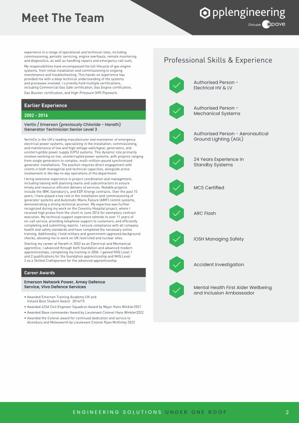 I bring extensive experience in project coordination and management, including liaising with planning teams and subcontractors to ensure timely and resource-efficient delivery of services. Notable projects include the IBM, Sainsbury’ s, and EDF Energy contracts. Over the past 15 years, I have played a key role in the installation and commissioning of generator systems and Automatic Mains Failure( AMF) control systems, demonstrating a strong technical acumen. My expertise was further recognized during my work on the Coventry Hospital project, where I received high praise from the client in June 2016 for exemplary contract execution. My technical support experience extends to over 11 years of on-call service, providing telephone support to customers, and efficiently completing and submitting reports. I ensure compliance with all company health and safety standards and have completed the necessary online training. Additionally, I hold military and government-approved background checks, allowing me to work on UK restricted and nuclear sites.