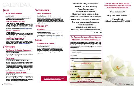 Contributions in honor or memory of a loved one go directly to the St. Francis High School Scholarship Fund, providing financial assistance for students. Your gift will be recognized in the Pax et Bonum Annual Report edition in the fall. Remembrance cards are sent to the family as requested, with no donation amount mentioned.