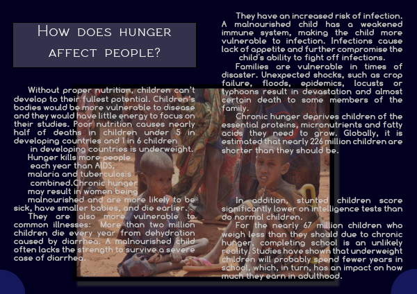 For the nearly 67 million children who weigh less than they should due to chronic hunger, completing school is an unlikely reality. Studies have shown that underweight children will probably spend fewer years in school, which, in turn, has an impact on how much they earn in adulthood.