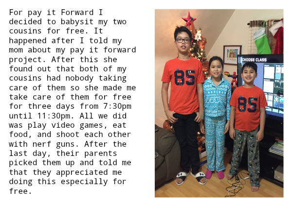 For pay it Forward I decided to babysit my two cousins for free. It happened after I told my mom about my pay it forward project. After this she found out that both of my cousins had nobody taking care of them so she made me take care of them for free for three days from 7:30pm until 11:30pm. All we did was play video games, eat food, and shoot each other with nerf guns. After the last day, their parents picked them up and told me that they appreciated me doing this especially for free.