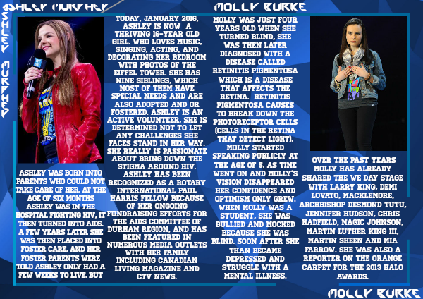 over the past years Molly has already shared the We Day stage with Larry King, Demi Lovato, Macklemore, Archbishop Desmond Tutu, Jennifer Hudson, Chris Hadfield, Magic Johnson, Martin Luther King III, Martin Sheen and Mia Farrow. She was also a reporter on the Orange Carpet for the 2013 Halo Awards.