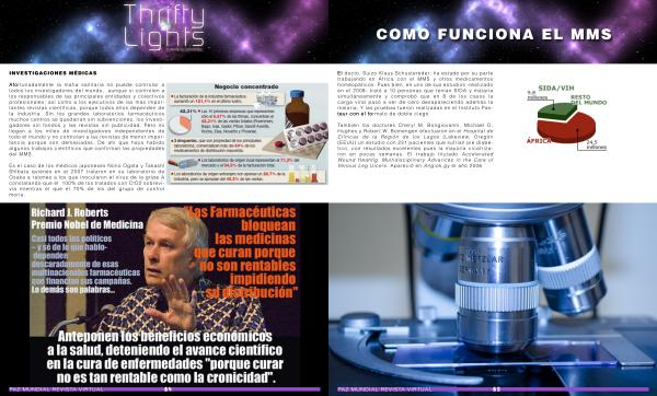 Afortunadamente la mafia sanitaria no puede controlara todoslosinvestigadoresdelmundo, aunquesicontrolena losresponsablesdelasprincipalesentidadesycolectivos profesionales; asícomoalosejecutivosdelasmásimportantesrevistascientíficas, porquetodoselosdependende la industria. Sin los grandes laboratorios farmacéuticos muchoscentrossequedaríansinsubvenciones, losinvestigadores sin fondos y las revistas sin publicidad. Pero no legan a los miles de investigadores independientes de todoelmundoynocontrolanalasrevistasdemenorimportancia porque son demasiadas. De ahíque haya habido algunostrabajoscientíficosqueconfirmanlaspropiedades delMMS.