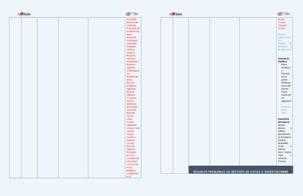 Sector circular Trapecio circular Razones trigonométri cas Ángulos de elevación y de depresión Geometría Analítica Plano cartesian o . Posición de un punto Distancia entre dos puntos Punto medio de un segmento . Ecuación de la recta Geometría del espacio Rectas , planos y sólidos geométricos en el espacio . Prismas pirámides , conos y esferas . Área lateral , total y volumen . Troncos . RESUELVE PROBLEMAS DE GESTIÓN DE DATOS E INCERTIDUMBRE