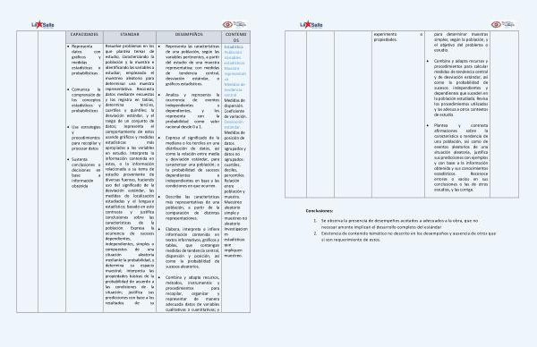 • Sustenta conclusiones o decisiones en base a información obtenida estadísticas más apropiadas a las variables en estudio . Interpreta la información contenida en estos , o la información relacionada a su tema de estudio proveniente de diversas fuentes , haciendo uso del significado de la desviación estándar , las medidas de localización estudiadas y el lenguaje estadístico ; basado en esto contrasta y justifica conclusiones sobre las características de la población . Expresa la ocurrencia de sucesos dependientes , independientes , simples o compuestos de una situación aleatoria mediante la probabilidad , y determina su espacio muestral ; interpreta las propiedades básicas de la probabilidad de acuerdo a las condiciones de la situación ; justifica sus predicciones con base a los resultados de su