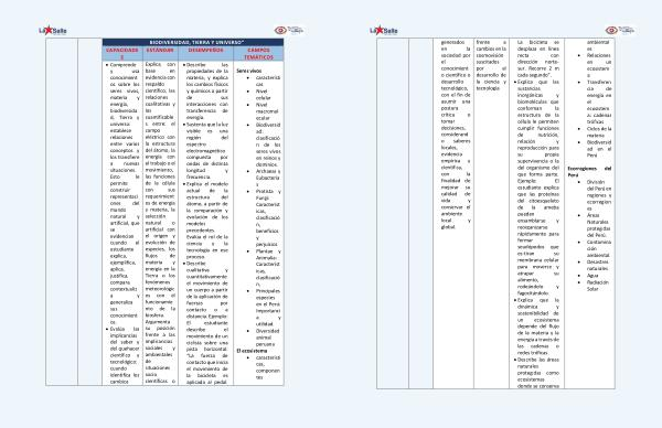 generados en la sociedad por el conocimient o científico o desarrollo tecnológico , con el fin de asumir una postura crítica o tomar decisiones , considerand o saberes locales , evidencia empírica y científica , con la finalidad de mejorar su calidad de vida y conservar el ambiente local y global . frente a cambios en la cosmovisión suscitados por el desarrollo de la ciencia y tecnología : La bicicleta se desplaza en línea recta con dirección norte- sur . Recorre 2 m cada segundo ”. • Explica que las sustancias inorgánicas y biomoléculas que conforman la estructura de la célula le permiten cumplir funciones de nutrición , relación y reproducción para su propia supervivencia o la del organismo del que forma parte . Ejemplo : El estudiante explica que las proteínas del citoesqueleto de la ameba pueden ensamblarse y reorganizarse rápidamente para formar seudópodos que es-tiran su membrana celular para moverse y atrapar su alimento , rodeándolo y fagocitándolo . • Explica que la dinámica y sostenibilidad de un ecosistema depende del flujo de la materia y la energía a través de las cadenas o redes tróficas . • Describe las áreas naturales protegidas como ecosistemas donde se conserva ambiental es • Relaciones en un ecosistem a • Transferen cia de energía en el ecosistem a : cadenas tróficas • Ciclos de la materia • Biodiversid ad en el Perú Ecorregiones del Perú • División del Perú en regiones y ecorregion es • Áreas Naturales protegidas del Perú . • Contamina ción ambiental . • Desastres naturales • Agua • Radiación Solar