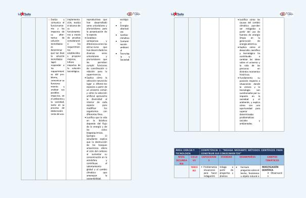 • Justifica cómo las causas del cambio climático pue-den ser mitigadas a partir del uso de fuentes de energía limpia en la generación de energía eléctrica . • Explica cómo el desarrollo científico y tecnológico ha contribuido a cambiar las ideas sobre el universo y la vida de las personas en distintos momentos históricos . • Fundamenta su posición respecto a situaciones donde la ciencia y la tecnología son cuestionadas por su impacto en la sociedad y el ambiente , y explica cómo son una oportunidad para superar determinadas problemáticas sociales y ambientales . ÁREA : CIENCIA Y TECNOLOGÍA COMPETENCIA 1 : “ INDAGA MEDIANTE MÉTODOS CIENTÍFICOS PARA CONSTRUIR SUS CONOCIMIENTOS ” NIVEL SECUNDA RIA CICLO VII CAPACIDADE S STANDAR DESEMPEÑOS CAMPOS TEMÁTICOS TERCE RO • Problematiza situaciones para hacer indagación : Indaga a partir de preguntas y plantea • Formula preguntas sobre el hecho , fenómeno u objeto natural o INVESTIGACIÓN CIENTÍFICA ‣ Observació n