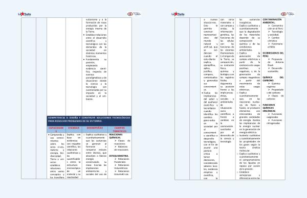 vulcanismo y a la formación de rocas producidos por la energía interna de la Tierra . • Establece relaciones entre el desarrollo científico y tecnológico con las demandas de la sociedad en distintos momentos históricos . • Fundamenta su posición , empleando evidencia científica , respecto de eventos paradigmáticos y de situaciones donde la ciencia y la tecnología son cuestionadas por su impacto en la sociedad y el ambiente . COMPETENCIA 3 : DISEÑA Y CONSTRUYE SOLUCIONES TECNOLÓGICAS PARA RESOLVER PROBLEMAS DE SU ENTORNO . CAPACIDADE S STANDAR DESEMPEÑOS CAMPOS TEMÁTICOS • Comprende y usa conocimientos sobre los seres vi-vos , materia y energía , biodiversidad , Tierra y universo : establece relaciones entre varios conceptos y los transfiere Explica , con base en evidencias con respaldo científico , las relaciones cualitativas y las cuantificable s entre : la estructura microscópica de un material y su reactividad o Explica cualitativa y cuantitativamente que las sustancias se generan al formarse o romperse enlaces entre átomos , que absorben o liberan energía conservando su masa . Eva-lúa las implicancias ambienta-les y sociales del uso de REACCIONES QUÍMICAS . ‣ Clases de reacciones ‣ Balanceo de reacciones ESTEQUIOMETRIA . ‣ Relaciones Ponderales ‣ Relaciones Volumétricas ‣ Relaciones Gravimétricas