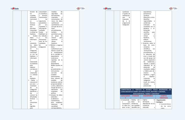 función de las variables , utilizando instrument os y diversas técnicas que permitan comprobar o refutar las hipótesis . • Analiza datos e informació n : interpreta los datos obtenidos en la indagación , contrastarl os con las hipótesis e informació n relacionada al problema para elaborar conclusione s que comprueba n o refutan las hipótesis . • Evalúa y comunica el pro-ceso y resultados de su indagación : identificar y dar a conocer las dificultades técnicas y los conocimien tos logrados para conocimient os científicos y formula conclusiones , las argumenta apoyándose en sus resultados e información confiable . Evalúa la fiabilidad de los métodos y las interpretaci ones de los resultados de su indagación . medidas de seguridad ; las herramientas , materiales e instrumentos de recojo de datos cualitativos / cuantitativos ; y el mar-gen de error . Estos procedimientos también le permitirán prever un grupo de control para confirmar o refutar la hipótesis . • Obtiene y organiza datos cualitativos / cuant itativos a partir de la manipulación de la variable independiente y mediciones repetidas de la variable dependiente . Realiza ajustes en sus procedimientos o instrumentos y con-trola las variables intervinientes ; hace cálculos de medidas de tendencia central , proporcionalidad u otros , obtiene el margen de error , y representa sus resultados en gráficas . • Compara los datos obtenidos ( cualitativos y cuantitativos ) para establecer relaciones de causalidad , correspondencia ,