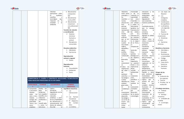 relaciones entre varios conceptos y los transfiere a nuevas situacio-nes . Esto le permite construir representaci ones del mundo natural y artificial , que se evidencian cuando el estu-diante explica , ejemplifica , aplica , justifica , compara , contextualiz a y generaliza sus conocimient os . • Evalúa las implicancias del saber y del quehacer cientí-fico y tecnológico : cuando identifica los cambios gene-rados en la sociedad por el conocimient o científico o desarrollo tecnológico , con el fin de asumir una postura crítica o tomar microscópic a de un material y su reactividad con otros materiales o con campos y ondas ; la información genética , las funciones de las células con las funciones de los sistemas ( homeostasi s ); el origen de la Tierra , su composición , su evolución física , química y biológica con los registros fósiles . Argumenta su posición frente a las implicancias éticas , sociales y ambientales de situaciones socio científicas o frente a cambios en la cosmovisión suscitados por el desarrollo de la ciencia y tecnología . estructura y las condiciones ambientales que posibilitan la degradación de esas sustancias . o Sustenta cualitativa y cuantitativamente que la energía térmica se conserva , transfiere o degrada en sólidos y fluidos . o Explica cómo la célula , a través de reacciones químicas , transforma los nutrientes y obtiene energía necesaria para realizar las funciones vita-les del ser humano . o Justifica los mecanismos de regulación en los sistemas ( regulación de temperatura , glucosa , hormonas , líquidos y sales ) para conservar la homeostasis del organismo humano o Explica que la síntesis de proteínas , que cumplen diversas funciones en el organismo , es producto de la transcripción y traducción de la secuencia de nucleótidos de los ácidos nucleicos . o Explica que la conservación del número de cromosomas ‣ Las leyes de Newton ‣ Los triángulos notables ‣ Condiciones de equilibrio ‣ La dinámica y la segunda les de Newton ‣ Fuerzas de rozamiento ‣ Dinámica circular ‣ Ejercicios diversos Genética y herencia ‣ Genotipo y fenotipo ‣ Dominancia y recesividad ‣ Código genético ‣ Leyes de la herencia ‣ Genética humana Origen de las especies ‣ Evolución de las especies ‣ Teorías ‣ Pruebas de la evolución El trabajo mecánico . ‣ Trabajo mecánico ‣ Ventaja mecánica ‣ Unidades de medida ‣ La energía . - clases