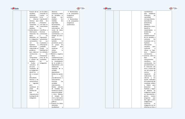 cuantitativos ) para establecer relaciones de causalidad , correspondencia , equivalencia , pertenencia , similitud , diferencia u otros . Identifica regularidades o tendencias . Predice el comportamiento de las variables y contrasta los resultados con su hipótesis e información científica , para confirmar o refutar su hipótesis . Elabora conclusiones . • Sustenta , sobre la base de conocimientos científicos , sus conclusiones , los procedimientos y la reducción del error a través del uso del grupo de control , la repetición de mediciones , los cálculos y los ajustes realizados en la obtención de resultados válidos y fiables para demostrar la hipótesis y lograr el objetivo . Su indagación puede ser reproducida o genera nuevas preguntas que den lugar a otras indagaciones . Comunica su indagación con un informe es-crito o