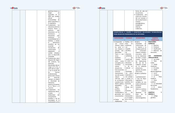 forma de vida de las personas . • Fundamenta una visión de sí mismo , del ser humano y del mundo frente a eventos paradigmáticos , empleando diversas evidencias . COMPETENCIA 3 : DISEÑA Y CONSTRUYE SOLUCIONES TECNOLÓGICAS PARA RESOLVER PROBLEMAS DE SU ENTORNO . CAPACIDADES STANDAR DESEMPEÑOS CAMPOS TEMÁTICOS • Comprende y usa conocimientos sobre los seres vivos , materia y energía , biodiversidad , Tierra y universo : establece relaciones entre varios conceptos y los transfiere a nuevas situacio-nes . Esto le permite construir representacio nes del mundo natural y artificial , que se evi-dencian cuando el estudiante explica , ejemplifica , aplica , justifica , compara , contextualiza y generaliza sus conocimientos . • Evalúa las implicancias Explica , con base en evidencias con respaldo científico , las relaciones cualitativas y las cuantificabl es entre : la estructura microscópic a de un material y su reactividad con otros materiales o con campos y ondas ; la información genética , las funciones de las células con las funciones de los sistemas ( homeostasi s ); el origen de la Tierra , su • Explica la propiedad de conservación de la materia y la energía a partir de la conversión materia- energía y vice-versa , como en las reacciones de fisión y fusión nuclear . Eva-lúa las implicancias del uso de la radiación nuclear en la industria alimentaria , agrícola , de salud , entre otras . • Explica cualitativa y cuantitativament e que los flujos magnéticos variables en una espira conductora producen corriente eléctrica continua o al-terna siguiendo las leyes de la inducción electromagnética . REACCIONES QUÍMICAS ‣ Reactivo ‣ Producto ‣ Clasificación ‣ Balanceo de reacciones LOS FENÓMENOS ONDULATORIOS ‣ Las ondas ‣ Tipos de ondas ‣ Ondas mecánicas ‣ El sonido ‣ Ondas electromagnéticas ‣ La luz ‣ La óptica ‣ La física moderna ‣ Física cuántica ‣ La relatividad de Einstein ‣ El efecto fotoeléctrico GENÉTICA Y HERENCIA ‣ Código genético