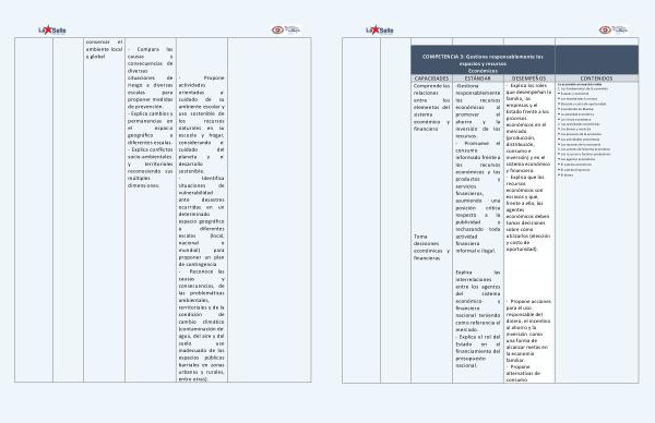 COMPETENCIA 3 : Gestiona responsablemente los espacios y recursos Económicos CAPACIDADES ESTÁNDAR DESEMPEÑOS CONTENIDOS Comprende las relaciones entre los elementos del sistema económico y financiero Toma decisiones económicas y financieras -Gestiona responsablemente los recursos económicos al promover el ahorro y la inversión de los recursos . - Promueve el consumo informado frente a los recursos económicos y los productos y servicios financieros , asumiendo una posición crítica respecto a la publicidad y rechazando toda actividad financiera informal e ilegal . Explica las interrelaciones entre los agentes del sistema económico y financiero nacional teniendo como referencia el mercado . - Explica el rol del Estado en el financiamiento del presupuesto nacional . - Explica los roles que desempeñan la familia , las empresas y el Estado frente a los procesos económicos en el mercado ( producción , distribución , consumo e inversión ) y en el sistema económico y financiero . - Explica que los recursos económicos son escasos y que , frente a ello , los agentes económicos deben tomar decisiones sobre cómo utilizarlos ( elección y costo de oportunidad ). - Propone acciones para el uso responsable del dinero , el incentivo al ahorro y la inversión como una forma de alcanzar metas en la economía familiar . - Propone alternativas de consumo La economía en nuestras vidas 1 . Los fundamentos de la economía • Escasez y economía • Las necesidades humanas • Elección y costo de oportunidad • La pirámide de Maslow • La actividad económica • La ciencia económica 2 . Las actividades económicas • Los bienes y servicios • Los procesos de la economía • Las actividades económicas • Los sectores de la economía 3 . Los actores del sistema económico • Los recursos o factores productivos • Los agentes económicos • El sistema económico • El sistema financiero • El dinero