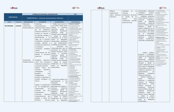 Explica la perspectiva de los protagonistas , relacionando sus acciones con sus motivaciones . Contrasta diversas interpretaciones del pasado , a partir de distintas fuentes históricos , desde la Segunda Revolución Industrial hasta la Primera Guerra Mundial y desde el primer militarismo en el Perú hasta la República Aristocrática , contribuye a una interpretación confiable de esa fuente . - Contrasta las interpretaciones que se presentan en diversas fuentes históricas sobre hechos o procesos históricos , desde la Segunda Revolución Industrial hasta la Primera Guerra Mundial y desde el primer militarismo en el Perú hasta la República Aristocrática .