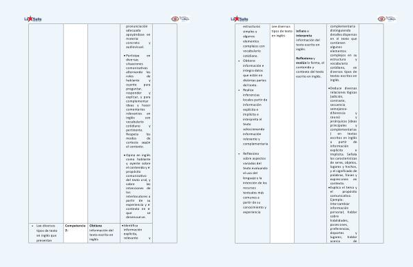 pronunciación adecuada apoyándose en material concreto y audiovisual . • Participa en diversas situaciones comunicativas alternando los roles de hablante y oyente para preguntar , responder y explicar , y para complementar ideas y hacer comentarios relevantes en inglés con vocabulario cotidiano y pertinente . Respeta los modos de cortesía según el contexto . • Opina en inglés como hablante y oyente sobre el contenido y el propósito comunicativo del texto oral , y sobre las intenciones de los interlocutores a partir de su experiencia y el contexto en el que se desenvuelve . • Lee diversos tipos de texto en inglés que presentan Competencia 2 : Obtiene información del texto escrito en inglés • Identifica información explícita , relevante y